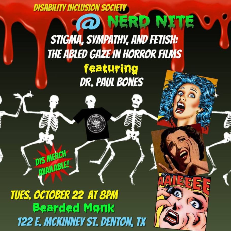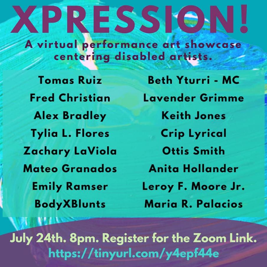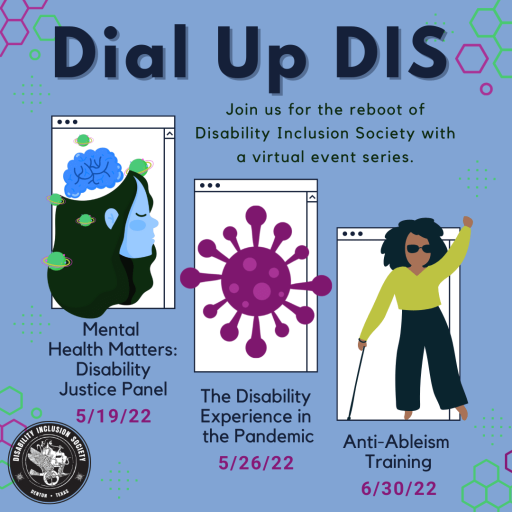 Photos of flyers from some of Disability Inclusion Society’s notable past events including Disability Pride Panel, Xpression 2020 Virtual Art Showcase, Sunday Brunch with Alex Montoya, Access Demands Action ADA 30: A Community Conversation, DIS the Season Holiday Hangout, Color of DIS, Sex Empowerment: A Disability Revolution, Crips & Cops: Panel Discussion on Police Violence and the Disability Community, Cripple Punk Music Show, Unheard: A Candlelit Vigil, Poverty in Disabled America, In DIS Together, Nerd Night – Stigma, Sympathy, and Fetish: The Able Gaze in Horror Films, Club Crip Virtual Dance Party, Disability Virtual Social Mixer, and Unlinking Violence and Mental Illness: A Community Forum.